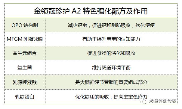 菁护A2加入六个基础强化配方和五个特色强化配方,特色强化配方分别是乳铁蛋白、益生菌、益生元组合、叶黄素、α-乳清蛋白。